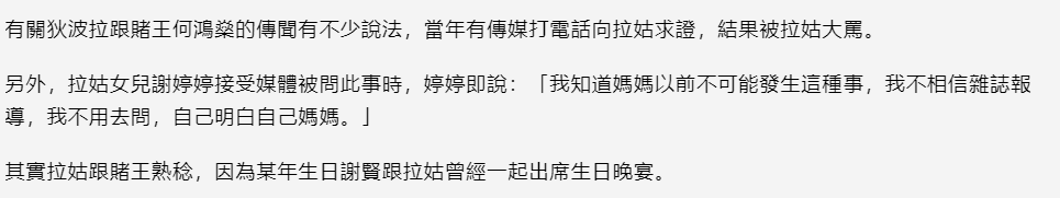 而且拉姑女儿谢婷婷也认真澄清过这事。据说拉姑和何鸿燊熟悉,只是因为某年生日时她带谢贤一起出席生日晚宴,两家从此关系不错而已。