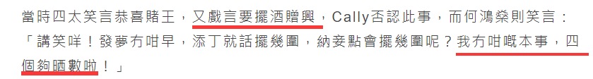 听到媒体喊邝美云“五太”,四太还说要摆酒赠兴,赌王就说:“开玩笑吗!……我没有这样的本事,四个就够数啦。”