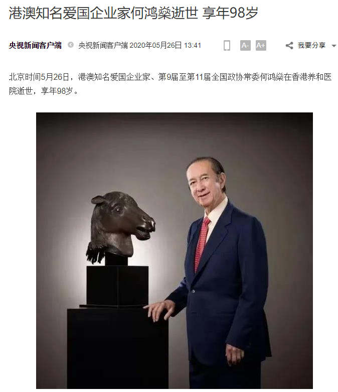 5月26日1时05分,澳门“赌王”何鸿燊病逝,享年98岁。