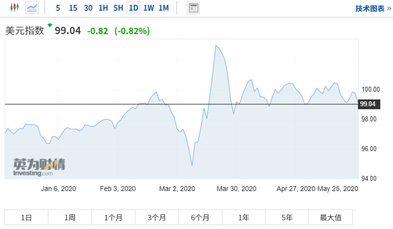 全球股市上涨打压避险情绪,美元指数大幅走低,美元指数跌0.8%,报99.04。美国COMEX黄金期货跌0.7%,报1723.65美元/盎司。