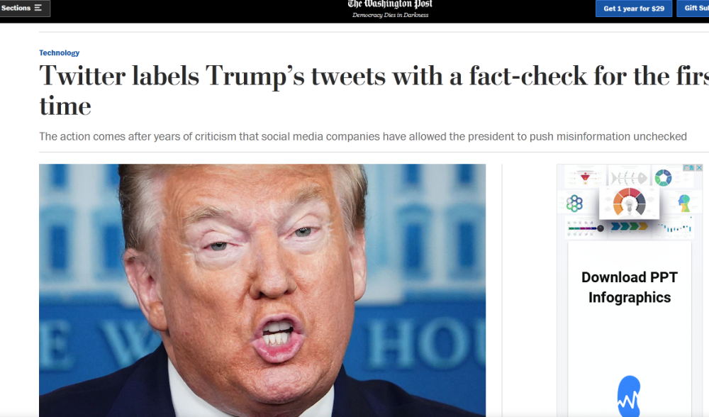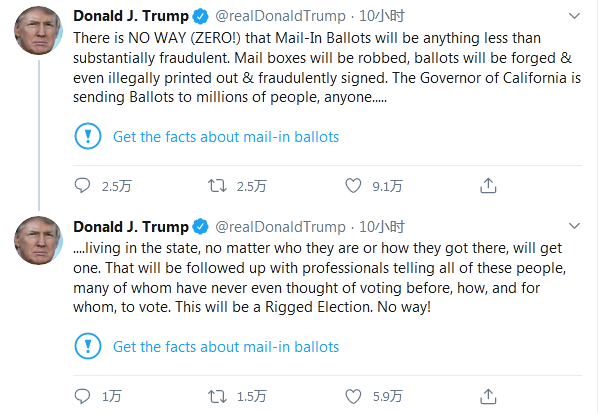 特朗普26日在推特上评价加州的“邮寄选票”,称选举将被操纵,“邮寄选票”实际上具有欺诈性。随后推特在特朗普的推文上标记了“获取邮寄选票事实”的标签,并将用户重新转到一个事实核查的页面,该页面包含一些媒体揭穿特朗普虚假陈述的新闻报道及一些其他用户的推文,为误导性的文章提供背景信息。《华盛顿邮报》说,推特这一举措在大选年让华盛顿和硅谷之间的紧张局势升级。