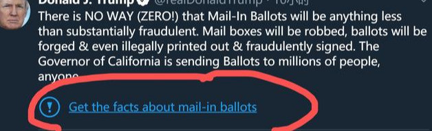 推特发言人凯蒂·罗斯伯勒表示,这些推文“包含了有关于投票过程的误导性信息,并已被贴上事实核查 标签,以向网民提供有关邮寄选票的更多信息。”