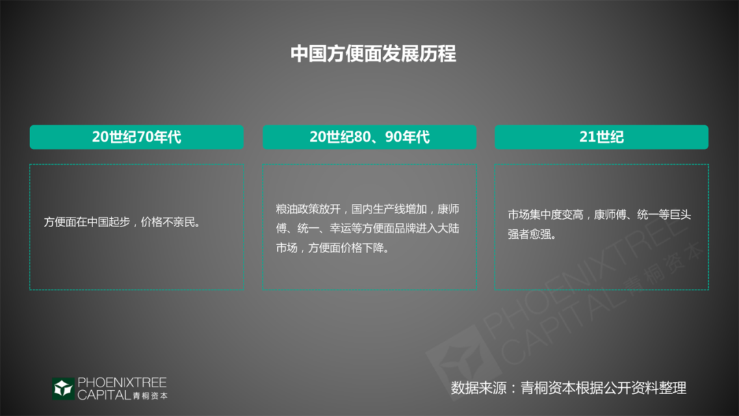 先简要梳理方便面发展逻辑,纵向来看,方便面在中国主要经历了多方品牌入局、价格战、巨头形成的阶段,最终市场集中度变高,康师傅、统一强者愈强。