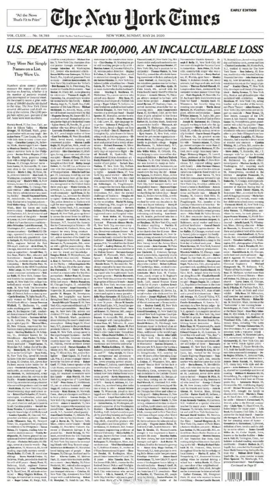 当地时间5月23日,纽约时报提前公布次日头版——《美国接近10万人死亡,无法计算的损失》。整个头版列出了1000名新冠肺炎死者的姓名、年龄和身份,并在导语中写道:“他们不仅是一个个名字,他们曾经是我们…”