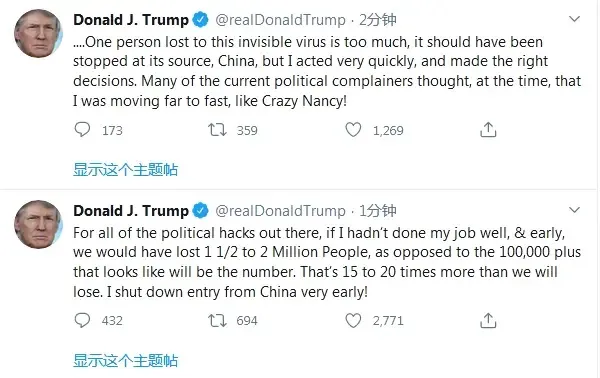 而刚在过去这个周末打完高尔夫球的美国总统特朗普26日发推回应说,如果不是他又早又好地做好自己的工作,美国的死亡人数会达150万到200万,而不是十多万人。 (综合:新华社、央视新闻、中国日报网) 文章已于修改