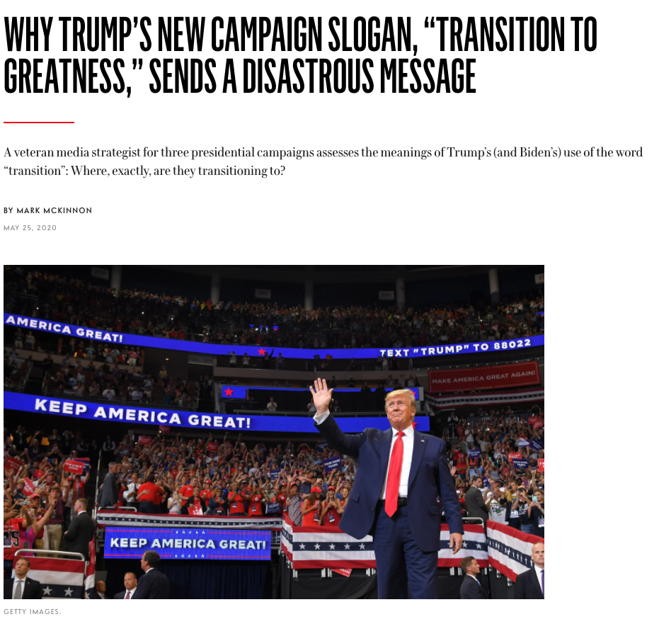 他写道:"我的判断是,"向伟大过渡"(这个口号)至少是令人困惑的,"而且:"它很有问题,因为它与特朗普在2016年成功推动的叙事方式背道而驰。大量推销膏药,虽然还没疗效,但请你再买一次吧,这次一定有效。2016年你把票投给了特朗普,虽然他还没有给你们带来伟大,但是,请你们再给他一次机会,让他把伟大带给你们。"