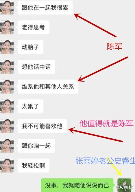 随着史睿生(她老公)爆料,在聊天中张雨婷多次指出自己不喜欢陈军只是把他当作“提款机”,在一起只是为了钱而已,和老公在一起更快乐,但事实却是她同时脚踏两只船。