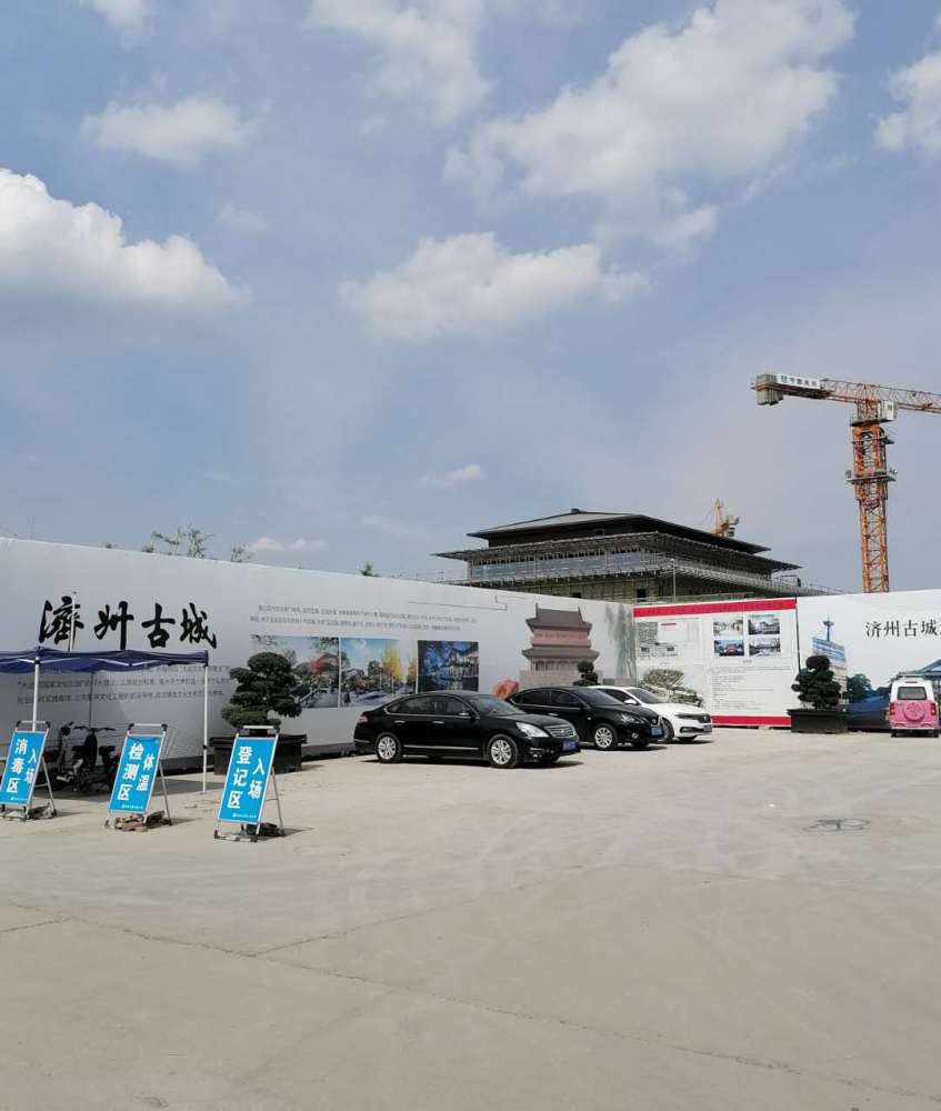 那么,如此“大手笔”的济州古城建设得怎么样了呢?从外围来看,项目建设进度很快,部分仿古建筑的主体结构已经成型。站在金宇路的南侧远远望去,济州古城的城墙已经高高隆起,清晰可见。城墙的颜色和造型与目前济宁市区太白楼上的老城墙非常相似。