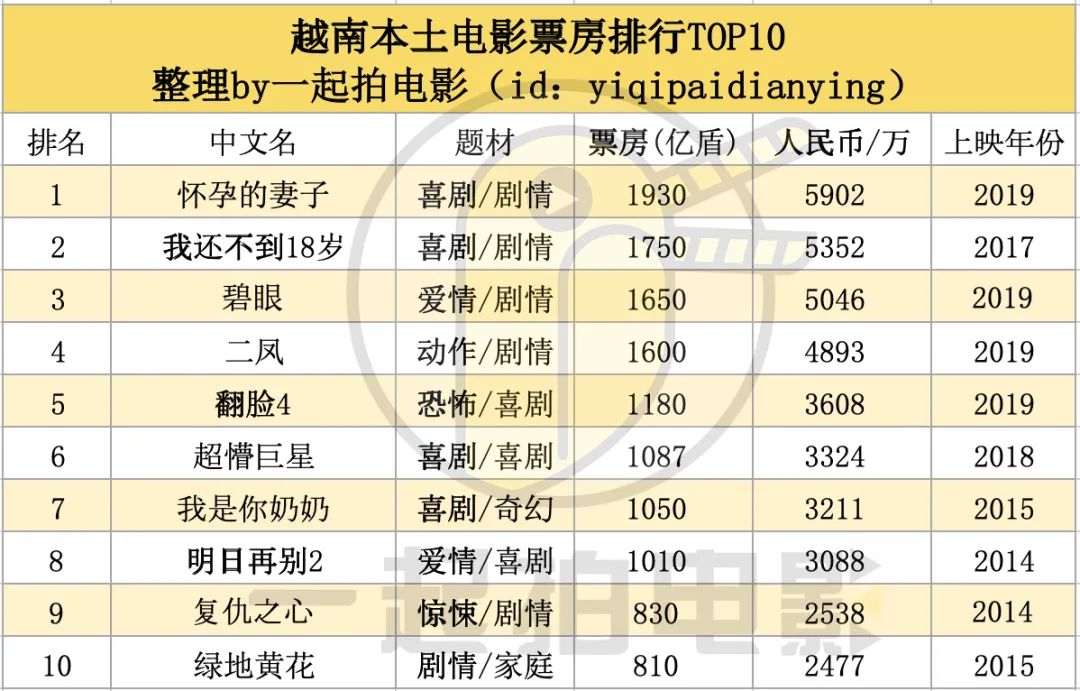 从题材类型来看,喜剧爱情以及惊悚恐怖片,依旧是越南本土题材影片取胜的关键,此外从《二凤》等动作题材影片在近几年的崛起以及《极限特工3》超出预期的票房表现,也能看出东南亚动作题材在当地较高的受欢迎程度。