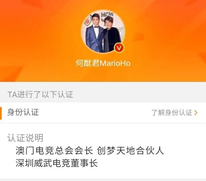 何猷君也许是看到了大家对他微博认证的争议,所以反应很快,迅速修改了微博认证,现在的微博认证已经由之前的社交名人,赌王何鸿燊四房儿子变成了澳门电竞总会会长、创梦天地合伙人、深圳威武电竞董事长,一下子就有了商业精英既视感。