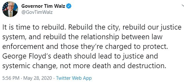 “现在是重建的时候了。重建我们的城市,重建我们的司法系统,重建执法人员和他们负责保护的人之间的关系。”沃尔兹在推特上写道:“乔治·弗洛伊德的死应该带来正义和系统性的变革,而不是更多的死亡和破坏。”