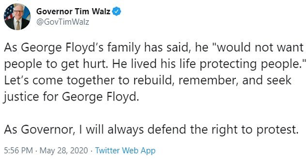“正如弗洛伊德的家人所说的那样,他‘不希望人们受到伤害’。他一生都在保护人民。作为州长,我将永远捍卫你们抗议的权利。”