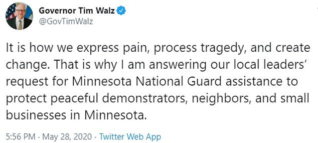 “这是我们表达痛苦、处理悲剧和寻求改变的方式。这就是为什么我要响应我们当地领导人的要求,要求明尼苏达州国民警卫队协助保护明尼苏达州的和平示威者、我们的邻居和小型企业。”