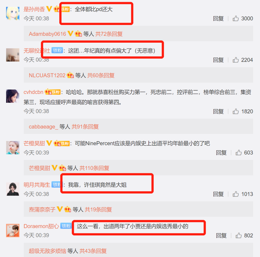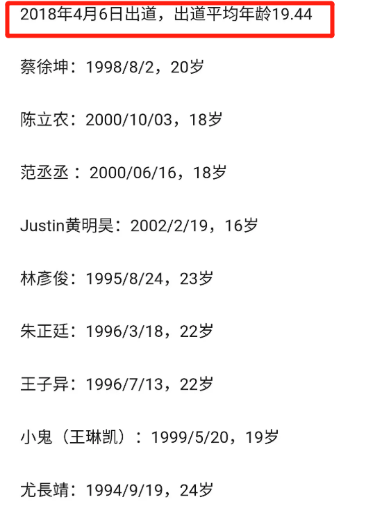 同年成团的Nine Precent,出道时平均年龄为19.44岁,其中年龄最大的是1994年出生的尤长靖,年龄最小的为黄明昊,出道时仅仅16岁。