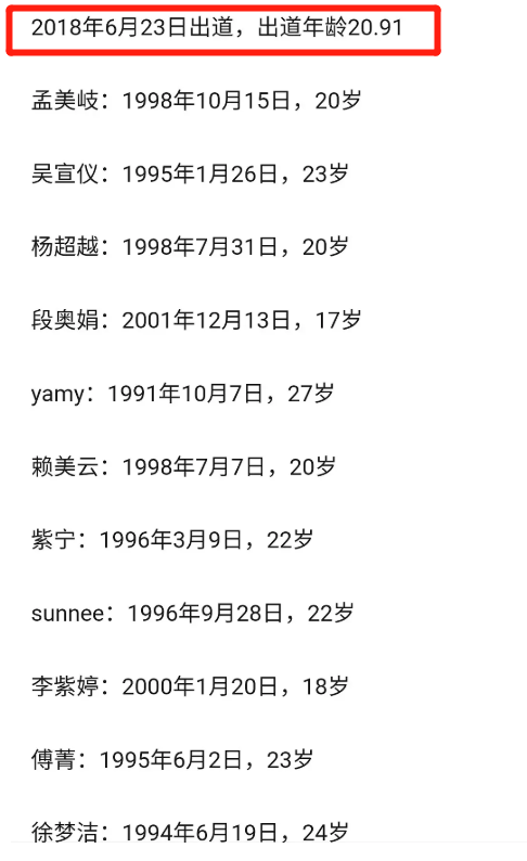 2018年出道的火箭少女101,平均出道年龄为20.91岁,差不多是21岁,其中,年龄最大的是yamy,出道时已经27岁了,年龄最小的是李紫婷,出道时仅为18岁。