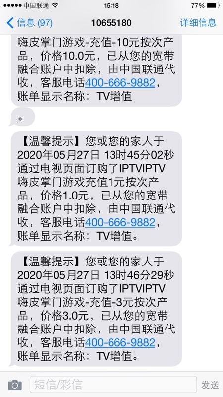 “您或您的家人于5月27日,通过电视页面订购了嗨皮掌门游戏,价格10元,已从您的宽带融合账户中扣除,由中国联通代收。”看到短信的李女士还没反应过来,5分钟之后手机上有出现了两条类似扣款的短信。