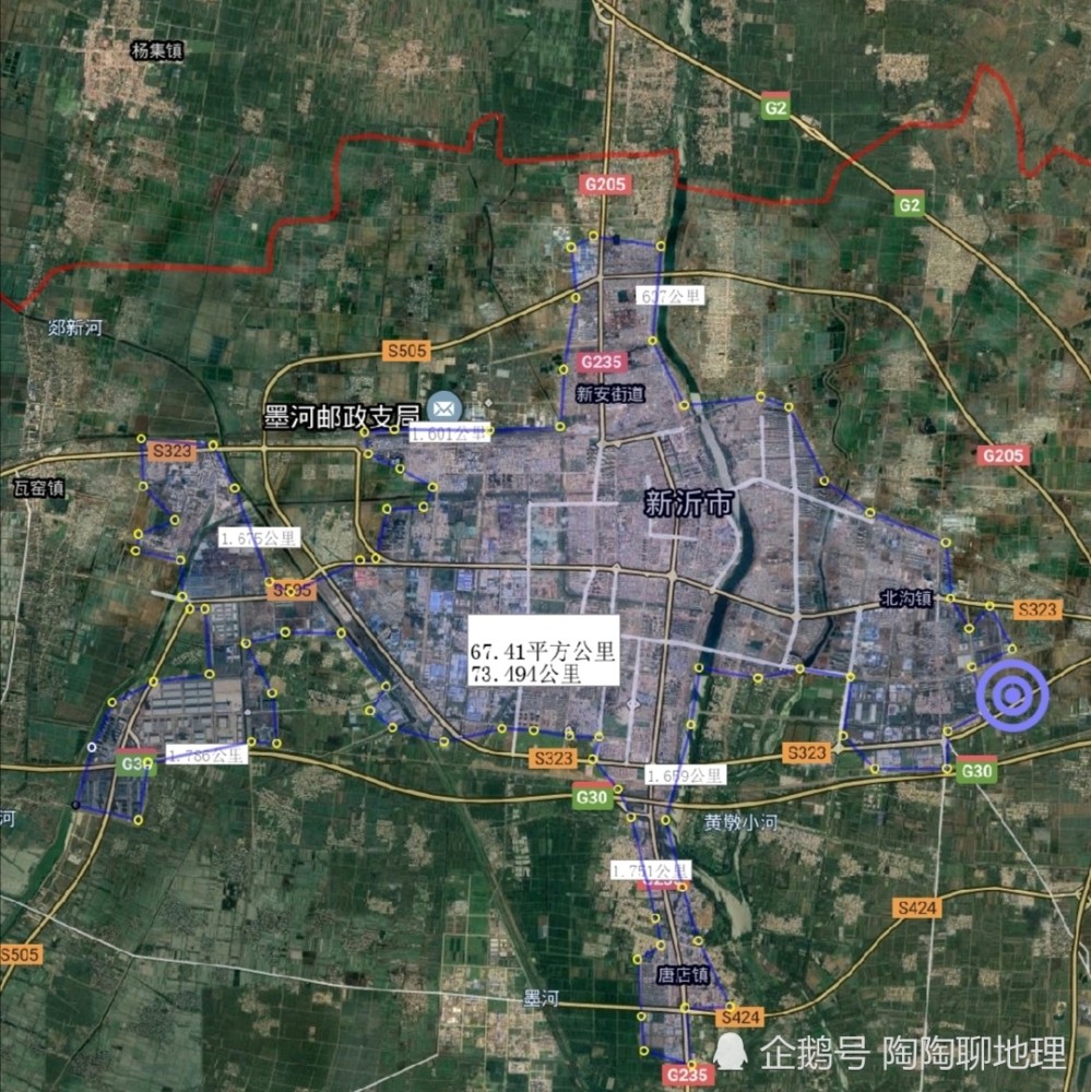 新沂城区建在沭河两岸的平原上,由于地势平坦,房屋和道路修建得方方正正,呈现豆腐块网格状。实测建成区面积为67.4平方公里。