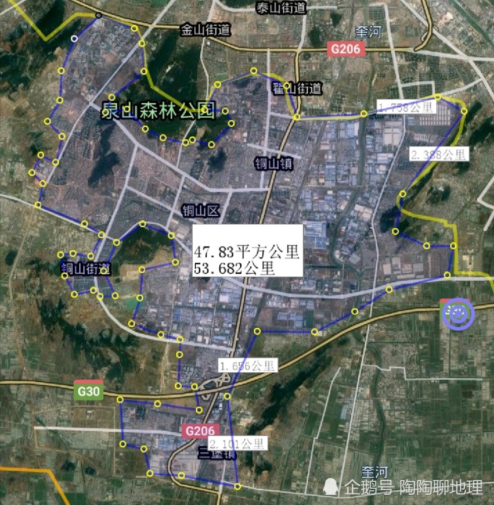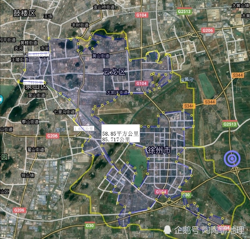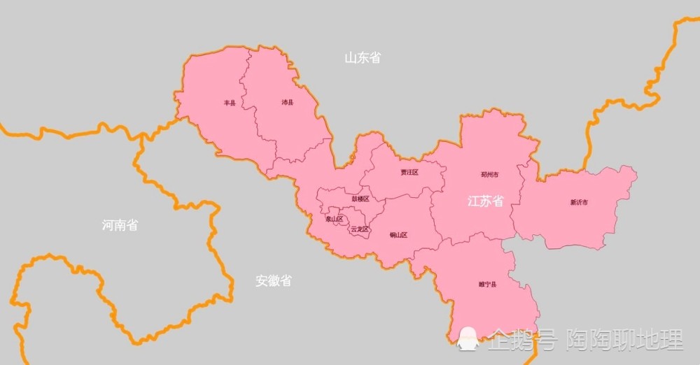 铜山区是徐州特大城市的核心区之一,与山东省、安徽省接壤,属于三省交界区。从地图上可以看到,铜山区快要把徐州市中心包围住。