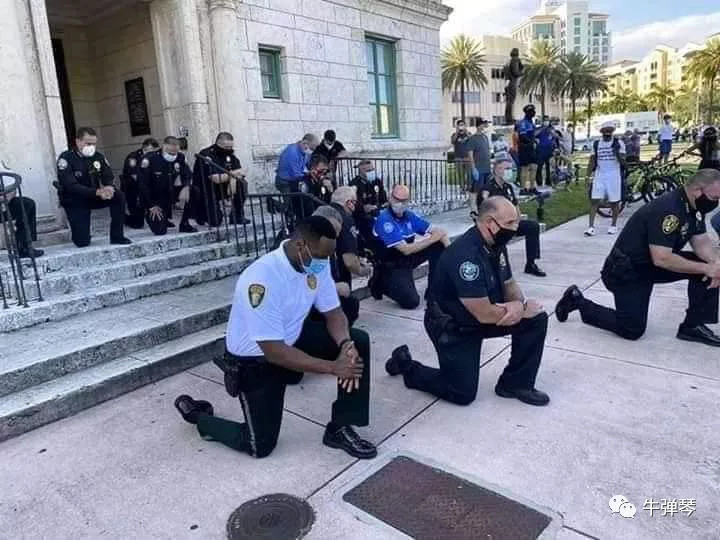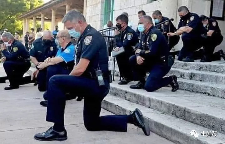 为平息民众愤怒,在不少城市,一些美国警察开始单膝跪地,和抗议民众共同祈祷。
