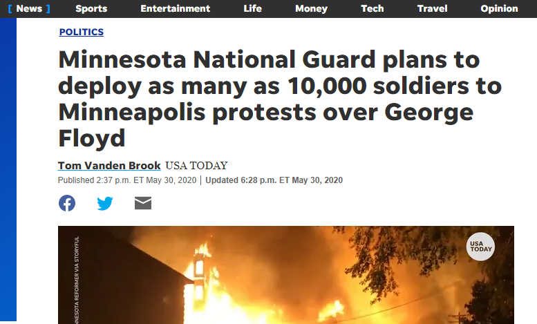 据今日美国网站30日报道,美国明尼苏达州国民警卫队计划部署多达1万名士兵,以应对明尼阿波利斯市的骚乱,这一数字与目前已被动员应对抗议活动的850名士兵相比,人数大幅增加。