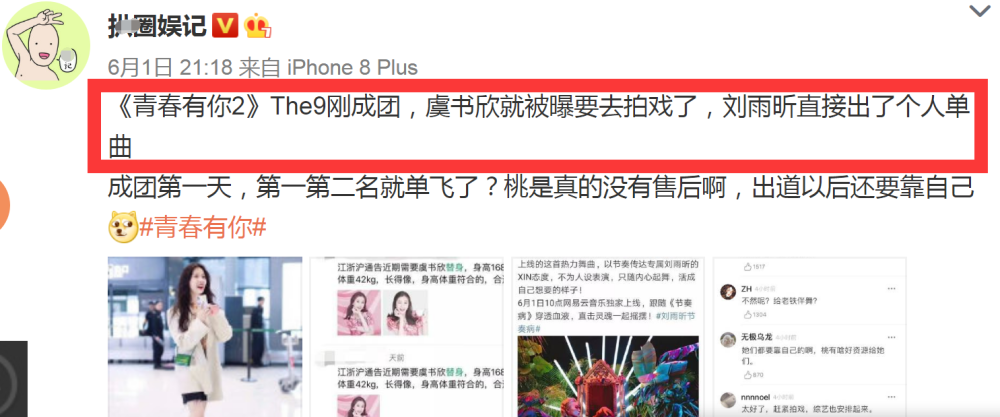 出道第二天刘雨昕就单曲了,那么其他的成员又有哪些资源呢?有网友曝料称排名第二的虞书欣即将进组拍戏。虞书欣原来就拍过戏,有很扎实的演戏基础,现在又有THE NINE九人团为支撑,所以她的资源将会越来越好。