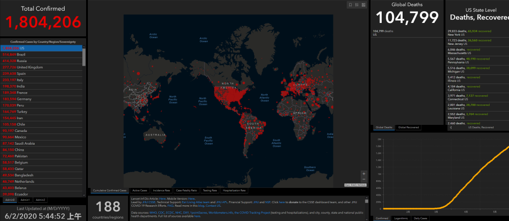 (观察者网讯)据约翰斯·霍普金斯大学发布的全球新冠肺炎数据,截至北京时间6月2日5时44分(美东时间6月1日17时32分),美国新冠肺炎累计确诊病例1804206例,累计死亡病例104799例。