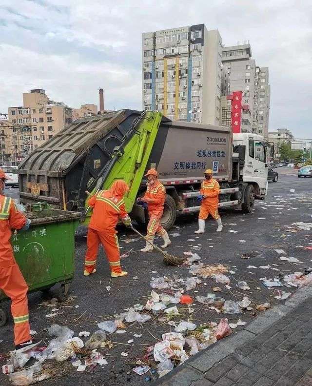 网 传图片显示,涉事区域的街道上留有很多塑料袋、一次性纸碗等餐厨垃圾,多名环卫工人在现场清扫。