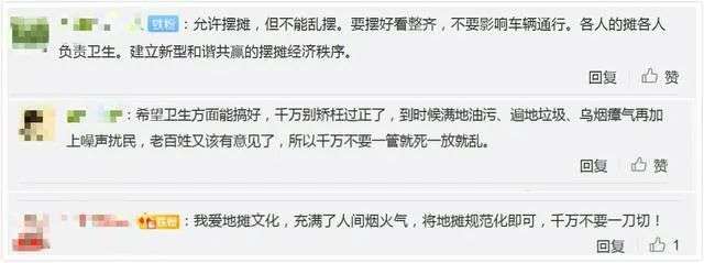 同时网友也纷纷给地摊经济发展支招:“保持卫生、专属区域、食品安全的底线也要坚守。”“允许摆摊,但不能乱摆,建立新型和谐共赢的地摊经济秩序。”“千万别矫枉过正,千万不要一刀切。”