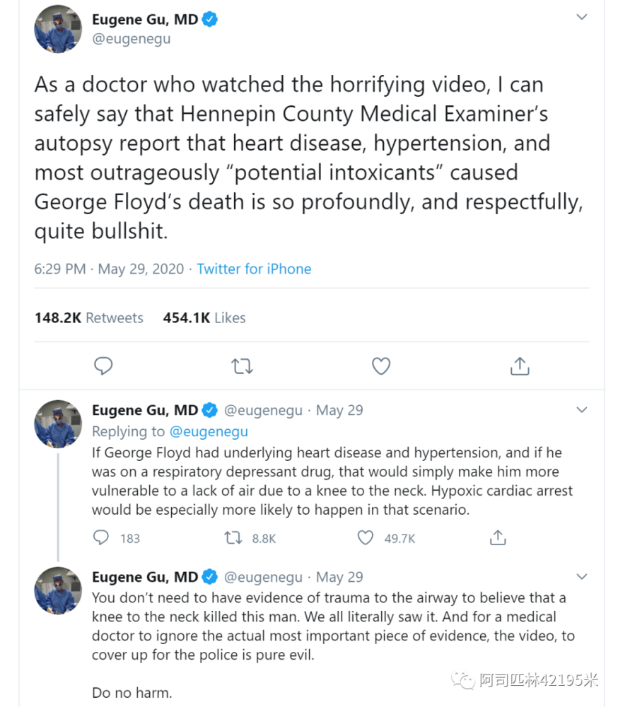 至此,当地法医和独立法医的尸检报告貌似相差很多,其实殊途同归,都指出警察长时间跪压在乔治颈部是致使他死亡的根本原因。