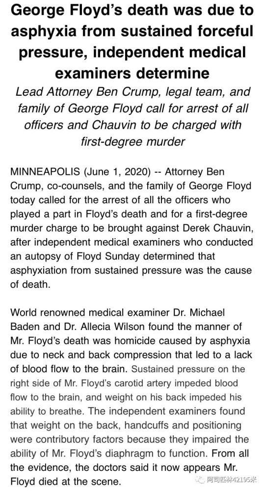 6月1日,两位独立法医和律师召开记者发布会,指出:乔治的死因是持续且有力的压迫造成的窒息。
