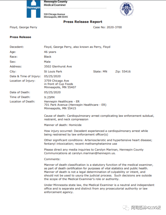第一个出来的是明尼苏达当地法医出的”初始报告“,因为美国要求“初始尸检报告”必须解剖后24小时之内发出。
