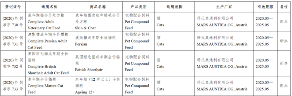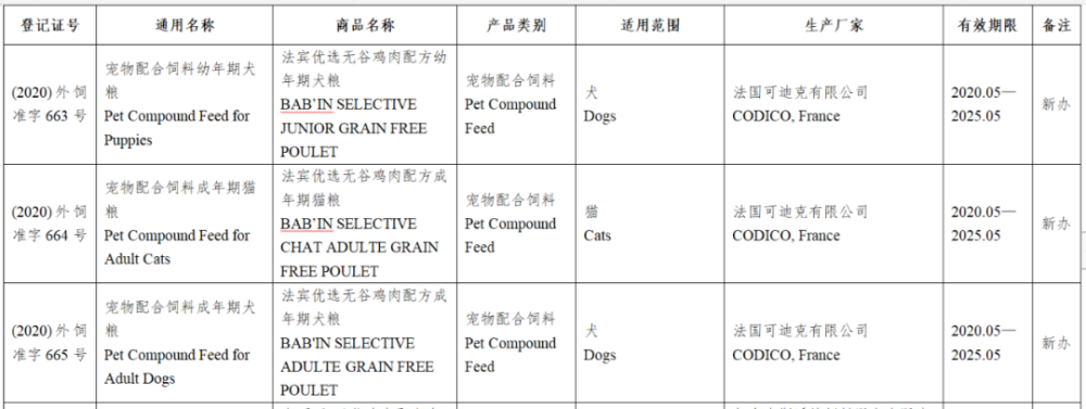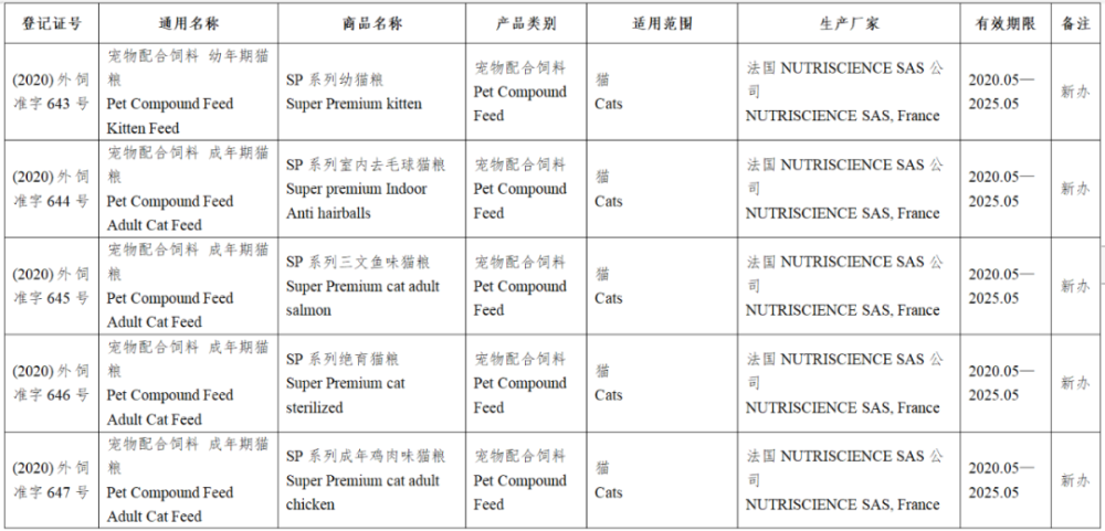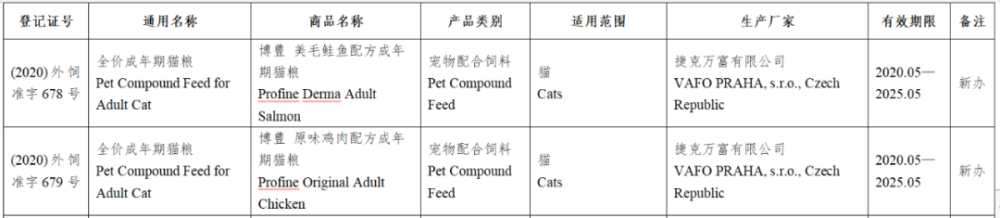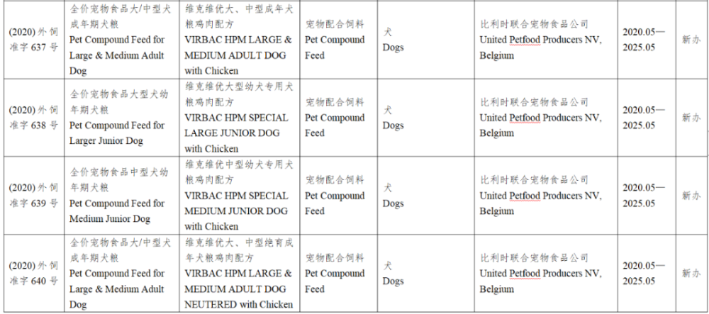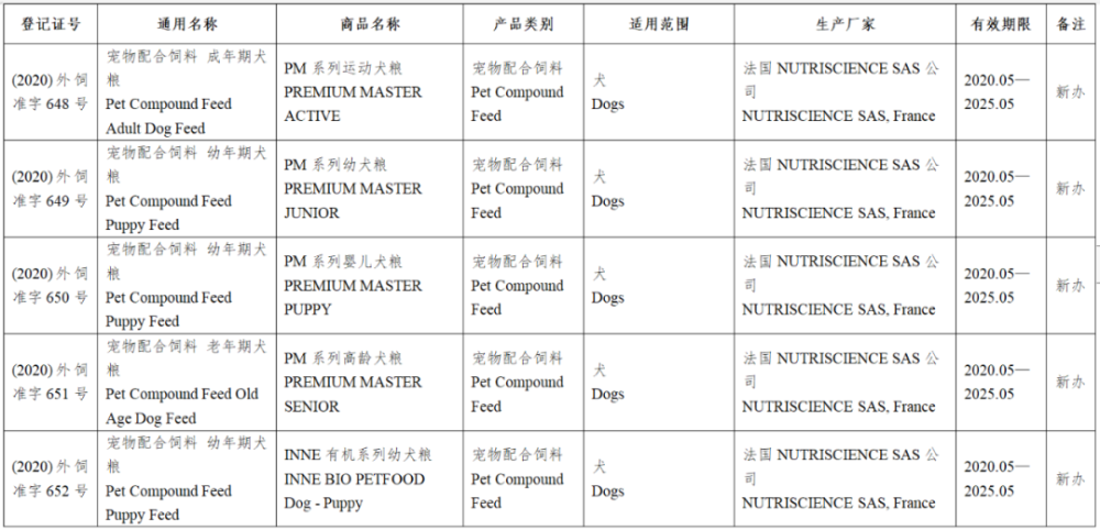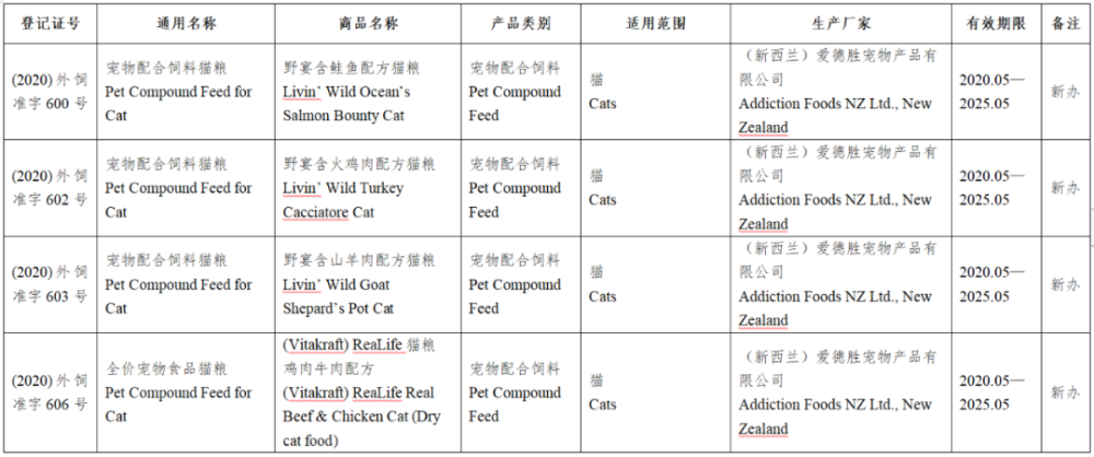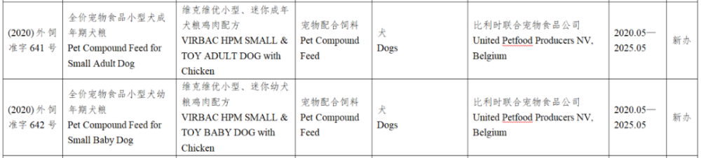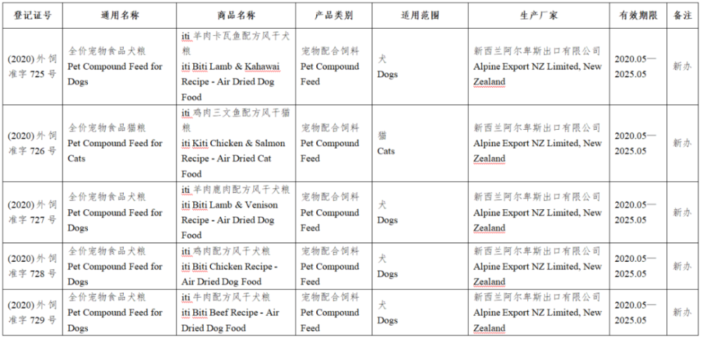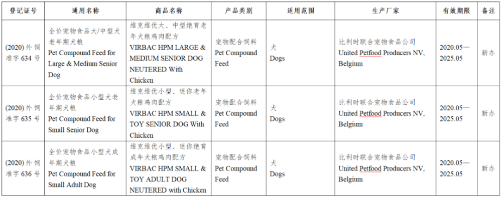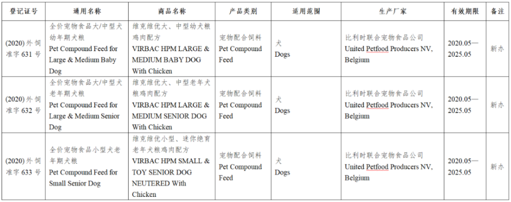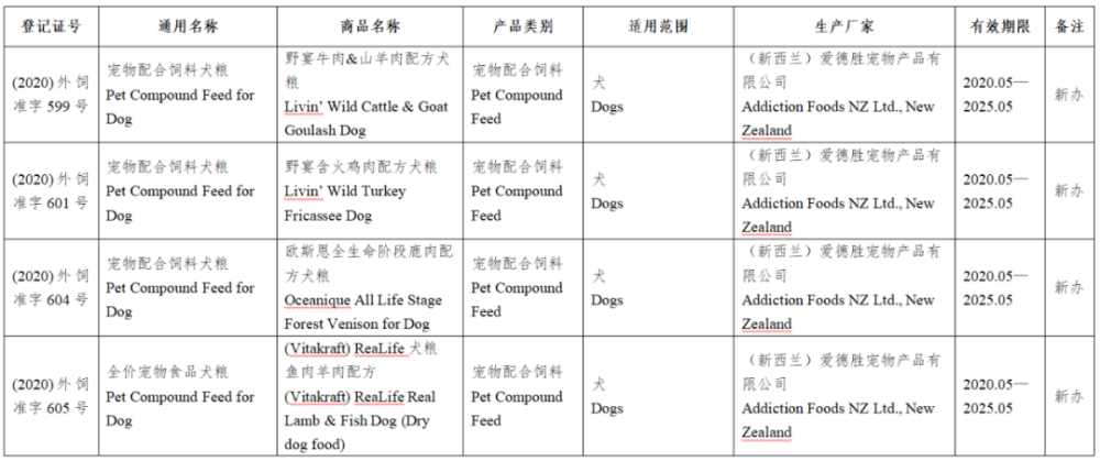 新获批登记明确用于宠物进口饲料和饲料添加剂产品(有效期2020.05—2025.05)的名单包括: