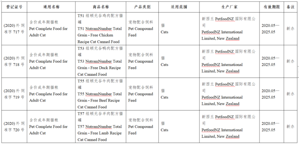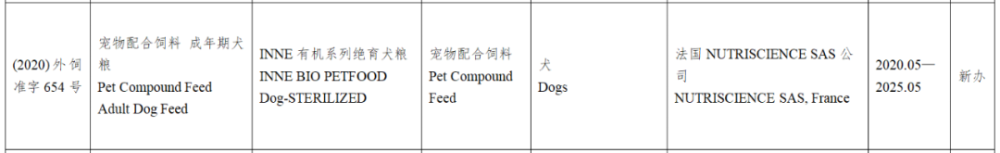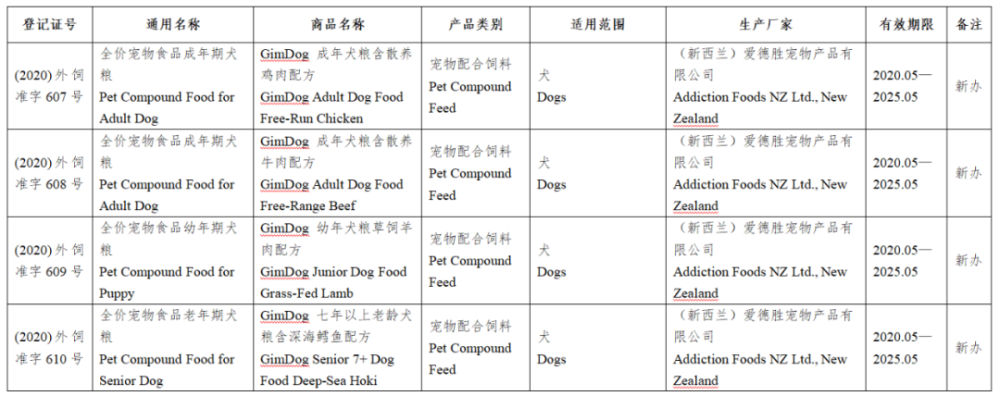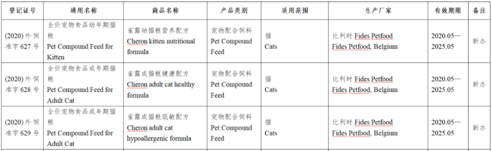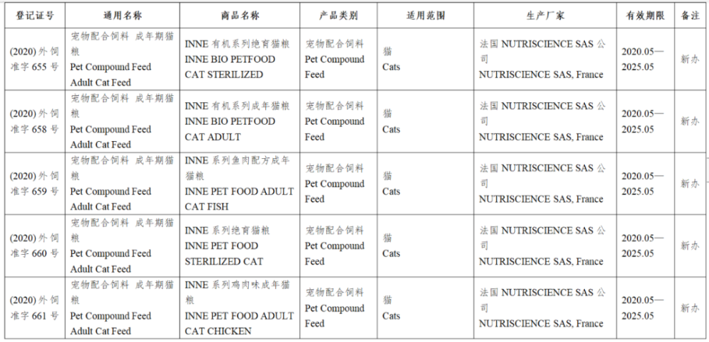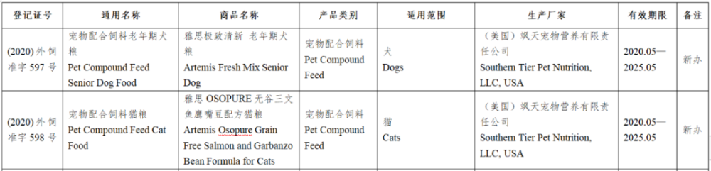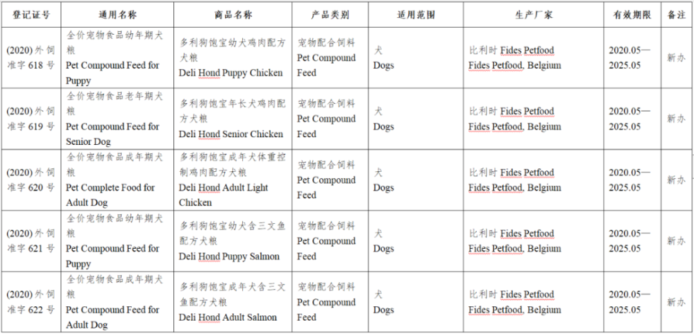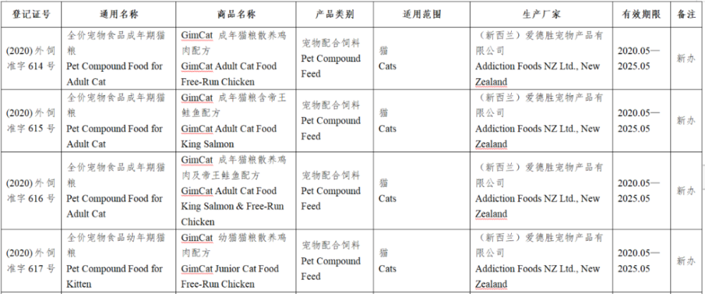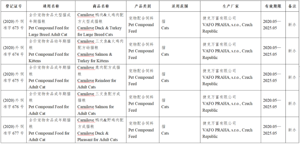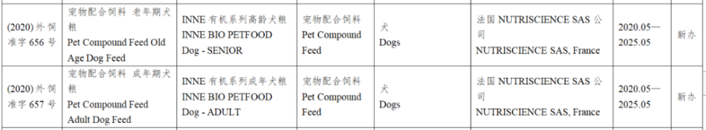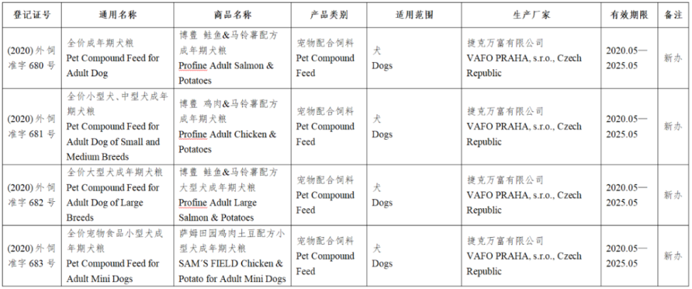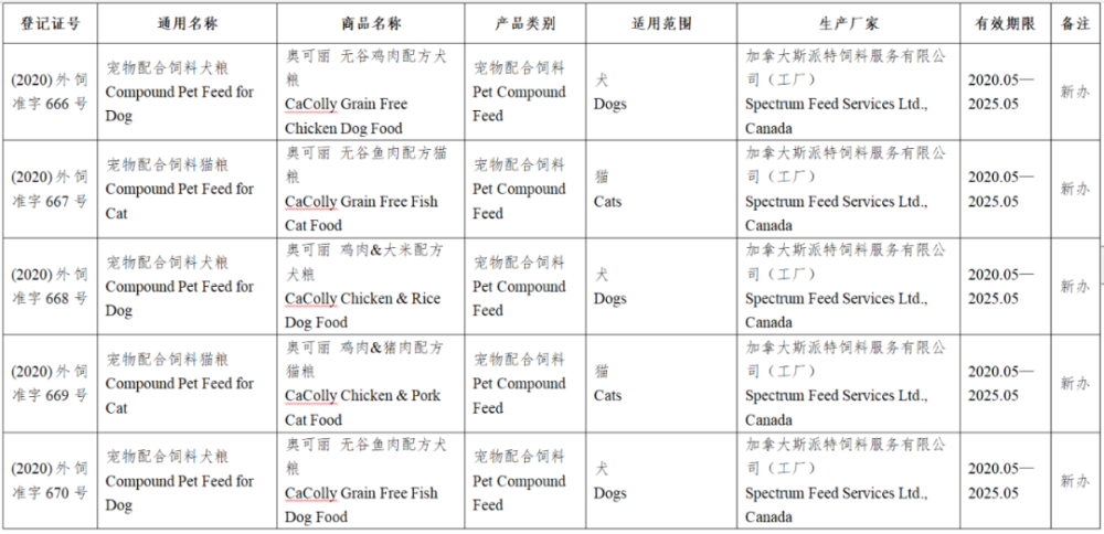 新获批登记明确用于宠物进口饲料和饲料添加剂产品(有效期2020.05—2025.05)的名单包括: