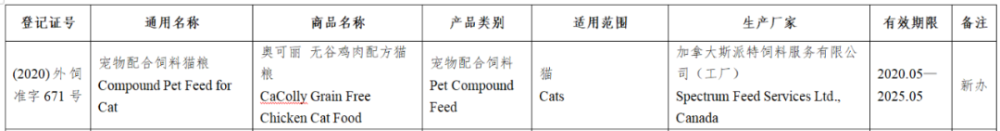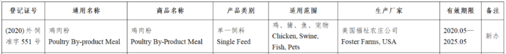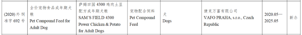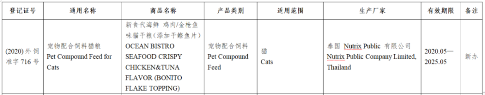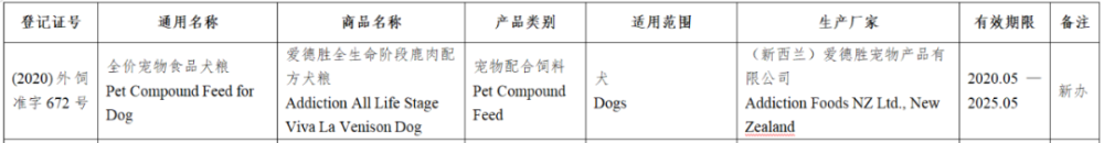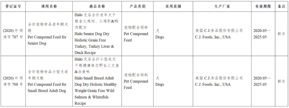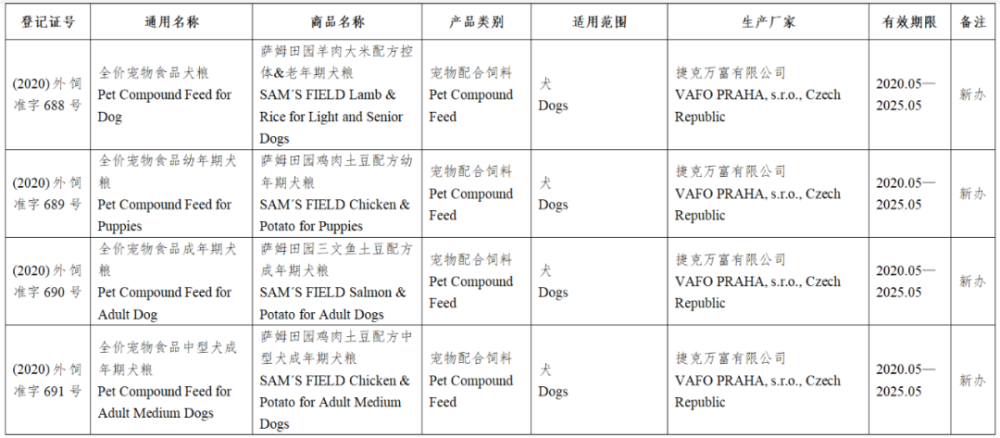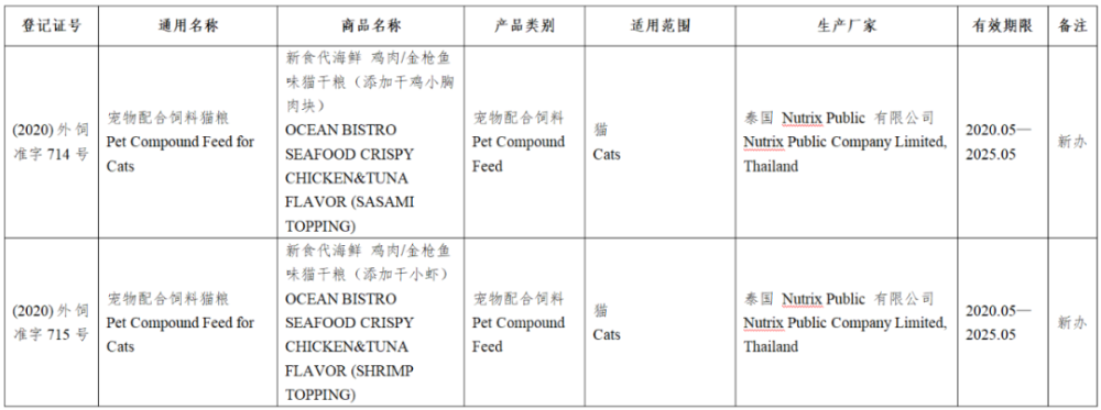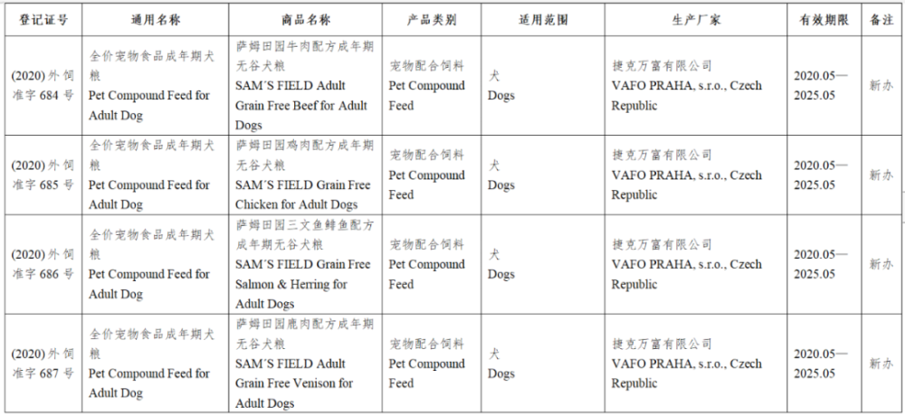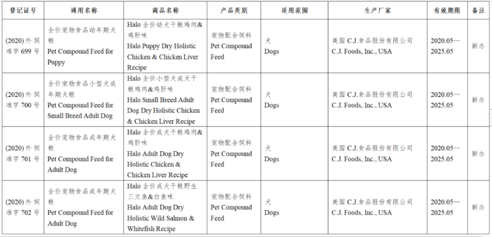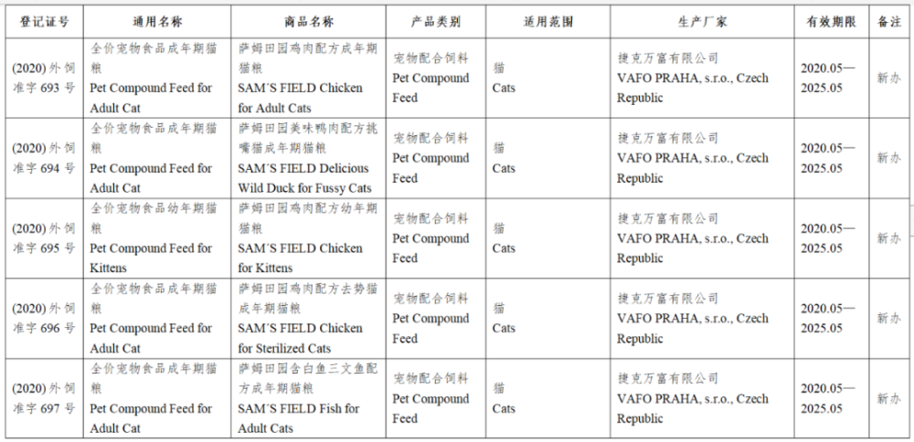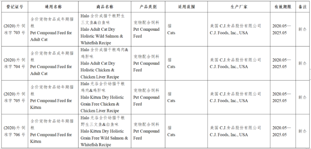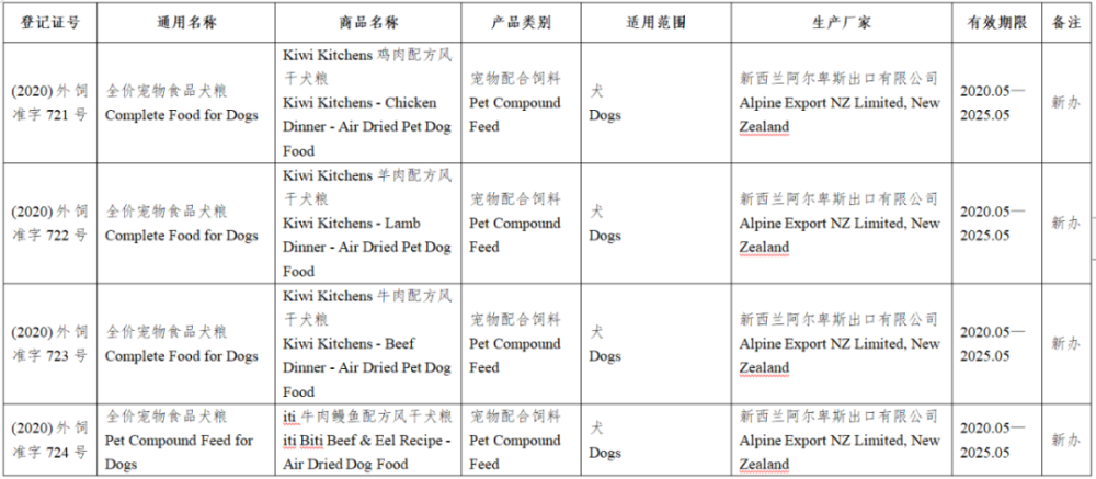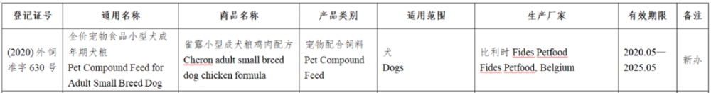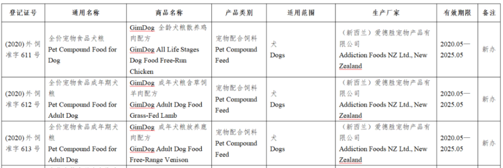 新获批登记明确用于宠物进口饲料和饲料添加剂产品(有效期2020.05—2025.05)的名单包括: