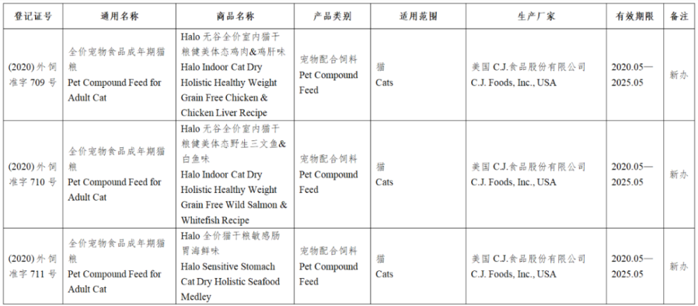 美国C.J.食品股份有限公司生产的全价宠物食品成年期猫粮——Halo全价成猫干粮野生三文鱼&白鱼味,Halo全价成猫干粮鸡肉&鸡肝味,Halo无谷全价室内猫干粮健美体态鸡肉&鸡肝味,Halo无谷全价室内猫干粮健美体态野生三文鱼&白鱼味,Halo全价猫干粮敏感肠胃海鲜味;全价宠物食品幼年期猫粮——Halo无谷全价幼猫干粮鸡肉&鸡肝味,Halo无谷全价幼猫干粮野生三文鱼&白鱼味;