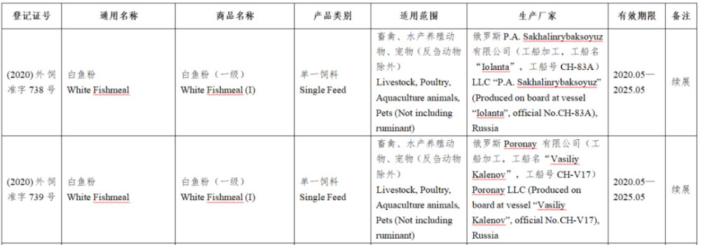 延期进口饲料和饲料添加剂产品登记证目录具体信息如下: