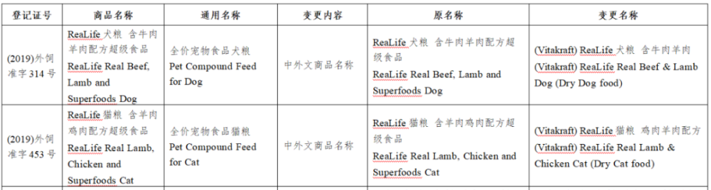 ReaLife犬粮含牛肉羊肉配方超级食品变更名称为(Vitakraft) ReaLife犬粮含牛肉羊肉。ReaLife猫粮含羊肉鸡肉配方超级食品变更名称为(Vitakraft) ReaLife猫粮鸡肉羊肉配方。