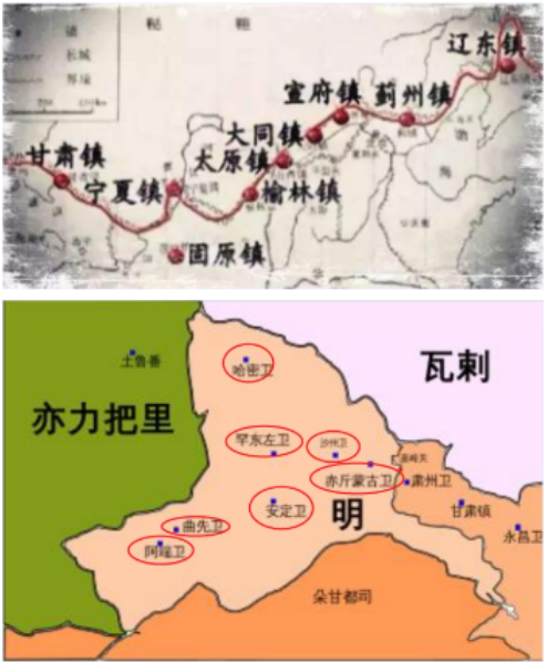 为了解决道路畅通的问题,明朝对河西走廊进行军事规划,军事防御体系得到升级,目的是防止北方的蒙古占领河西走廊,切断通往西域的道路。而长城也是明朝重点建设的,围绕长城展开各种防御体系的建设。其中九大边防重镇,成为明朝北方的军事防御支点。而关西七卫分别是安定卫、阿端卫、曲先卫、罕东卫、沙洲卫、赤斤蒙古卫、哈密卫。它们的作用是承担起防御西域,保障河西走廊的畅通,连接起内地。