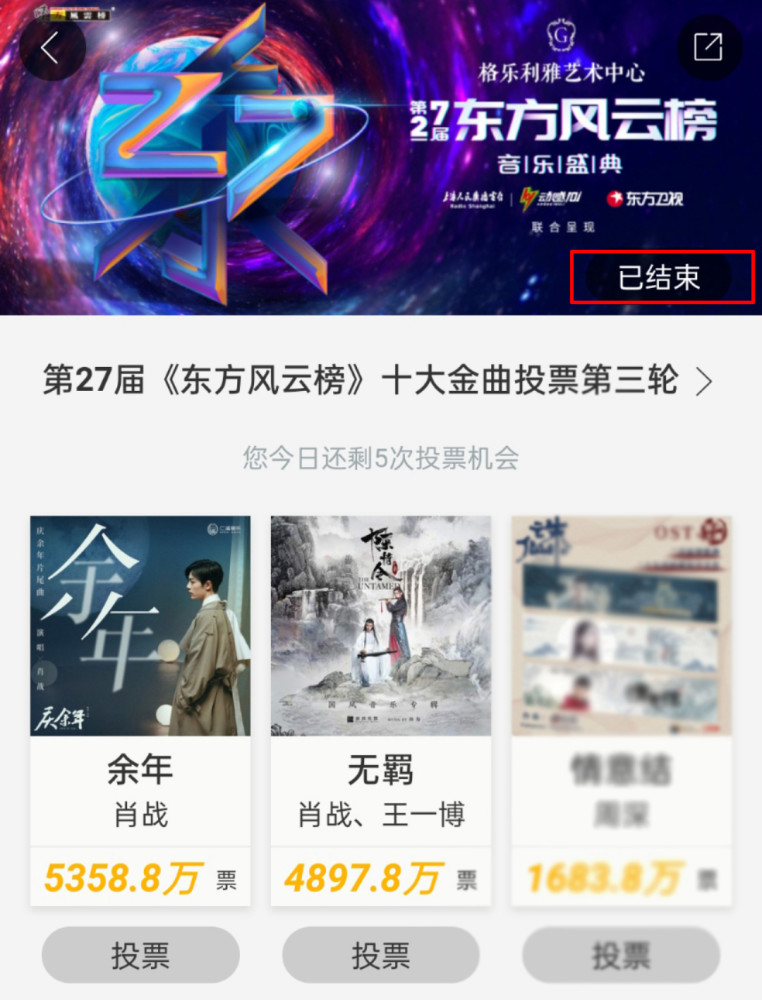 由上海人民广播电视台举办的第二十七届《东方风云榜》,历经30天的投票时间终于在今日拉下了帷幕。最终结果肖战获得两首进入年度十大金曲榜的资格,一首是肖战独唱的《余年》,也是2019年热播剧《庆余年》中的片尾曲,另外一首则是与王一博合唱的《无羁》。其中肖战一个名就霸占了前两名,恭喜肖战,也恭喜每个热爱肖战的粉丝们。