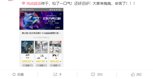 就今天中午12点经历了30天《东方风云榜》投票时间结束后,肖战也是获得了年度十大金曲榜的资格后,不少肖战的粉丝们纷纷发文感叹道终于可以松一口气了。听到这样的字眼,给我的感觉就是不容易。