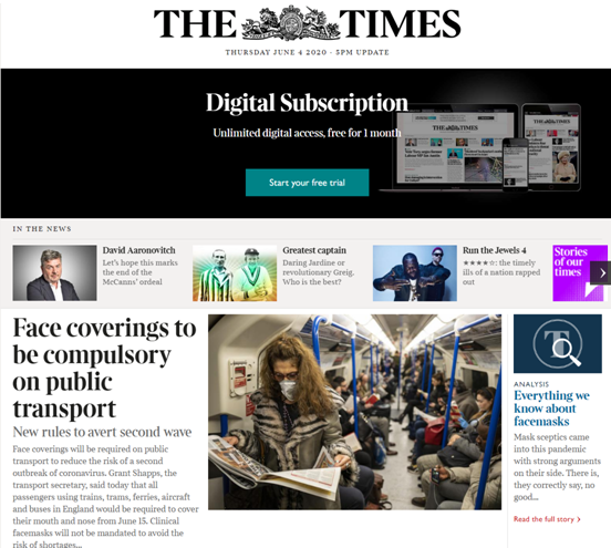 英国《泰晤士报》:乘坐公共交通工具要有脸部遮蔽物