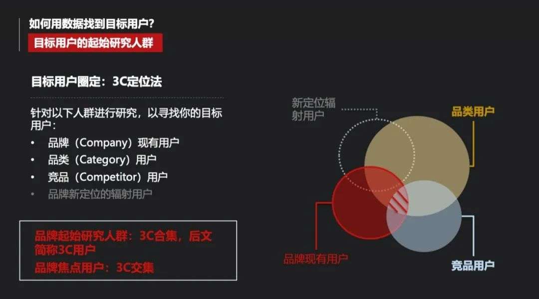 我在三年前提出研究用户的3C定位法,即品牌(Company)现有用户、品类(Category)用户、竞品(Competitor)用户。品牌起始研究人群是3C合集,焦点用户是3C交集。用这种方法,可以帮你找到目标用户。