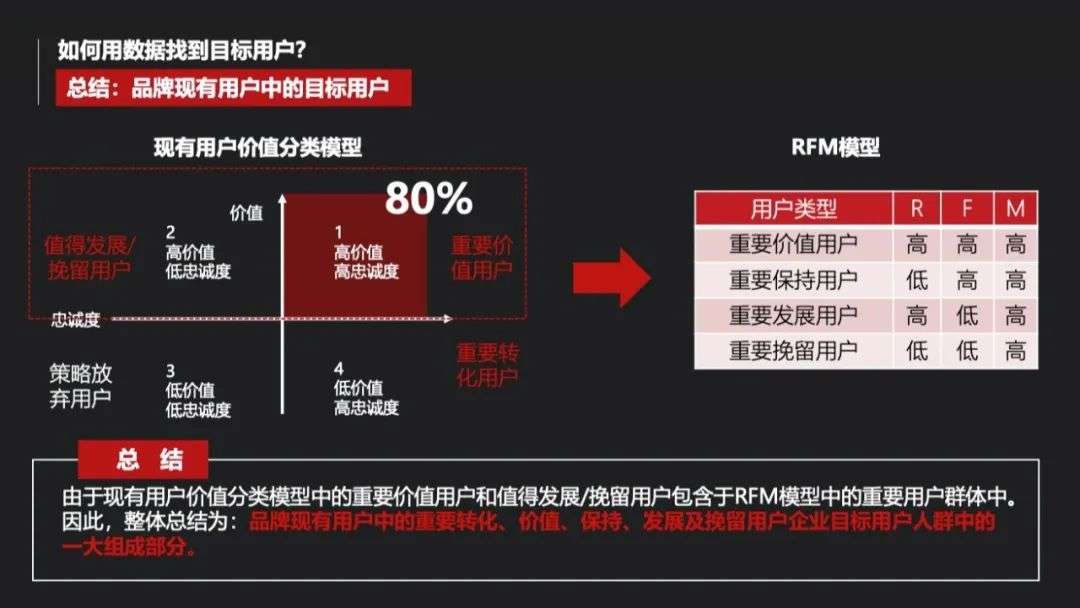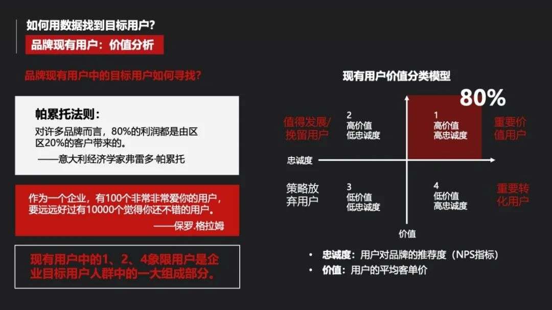 现有用户是我们最容易找到的,可以用一个模型来分析,叫用户价值分类模型。著名的二八法则在这里也能体现:对许多品牌而言,80%的利润由20%的客户带来。