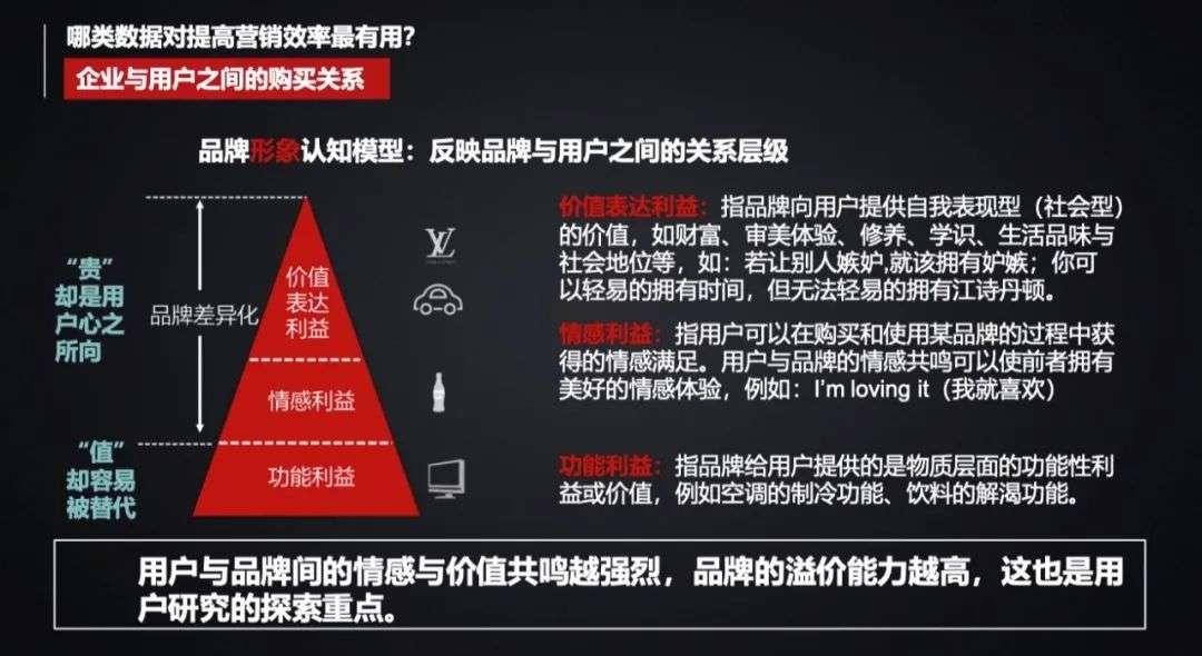 提高营销效率的关键是改善企业和用户的购买关系,价值共鸣越强,品牌溢价能力越高。同时在做用户调研时,小数据是探索用户内心的最高效方法,这点尤为重要。
