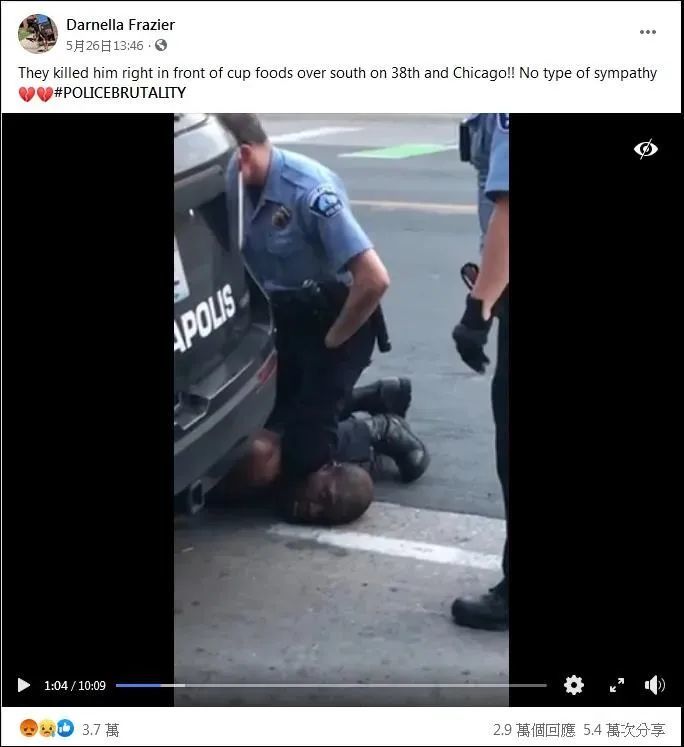 弗雷泽的脸书账号显示,当地时间5月26日,她上传了弗洛伊德遭警察跪压颈部的视频片段。随着视频的快速传播,来自各方的质疑声,也深深伤害了她。很多人批评弗雷泽“为何除了拍下视频什么都没做”。还有人告诉她,她本应该做更多事帮助弗洛伊德,例如制止警察。
