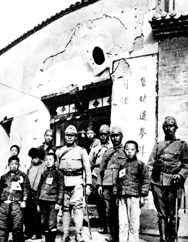 攻占了绥远的日军田中部队,故作姿态的与“良民”合影,体现日军所谓的“亲善”。
