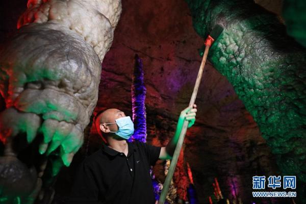 6月12日,湖南张家界黄龙洞景区工作人员在清洁溶洞内的钟乳石。 黄龙洞是张家界著名的溶洞旅游景区,洞内钟乳石数量众多。溶洞清洁保养工人定期对钟乳石进行巡查管护,清理钟乳石表面的苔藓、积尘等,让钟乳石以良好的状态展现给游人。 新华社发(吴勇兵 摄)