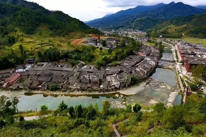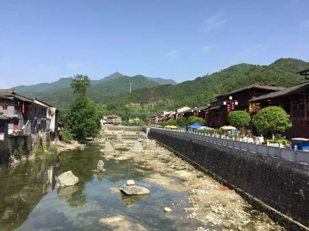 整个古镇斜倚在山坡,620余米石板街衔水沿山蜿蜒而上,曲径通幽,明清时的青瓦当、木板房,古戏楼、闸门、牌楼、古老院落、阁楼、吊脚楼依山临水栉比而建,源远流长的富水河沿镇流过,古蜀先民在此留下了独一无二的宝贵文化遗产。