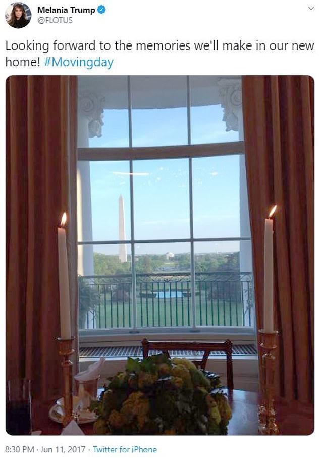 2017年6月11日,梅拉尼娅在社交媒体上发了一张从白宫阳台窗口拍的照片,写道:"盼望在我们的新家创造回忆。"正式官宣搬入白宫。