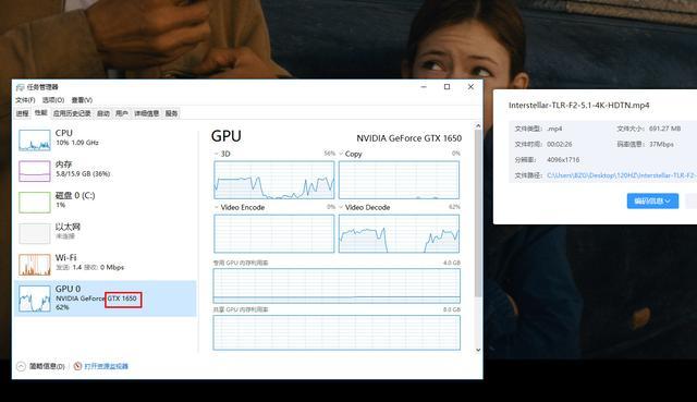 可以看到,播放4K视频时候,GTX1650显卡的视频解码上工作很勤奋,反而让CPU清闲下来了,这不是挺好嘛,毕竟我们现在手机、微单拍的4K视频也很多了。